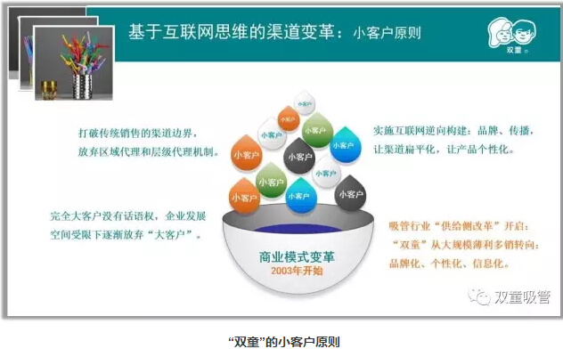 現(xiàn)在,“雙童”的小客戶達(dá)到了12000多家,這些寶貴的客戶客觀上與企業(yè)一直發(fā)生著貿(mào)易關(guān)系。正是因?yàn)橛唵晤~不大,對(duì)產(chǎn)品有個(gè)性化要求,反而造就了很高的品牌黏性,通過(guò)訂單的積累,長(zhǎng)期為企業(yè)創(chuàng)造著價(jià)值。通過(guò)實(shí)施“小客戶原則”和“兩條腿走路”戰(zhàn)略,“雙童”在客戶數(shù)量提高的同時(shí)風(fēng)險(xiǎn)大大下降,從而抓住了企業(yè)的主動(dòng)權(quán),帶動(dòng)品牌的提升!