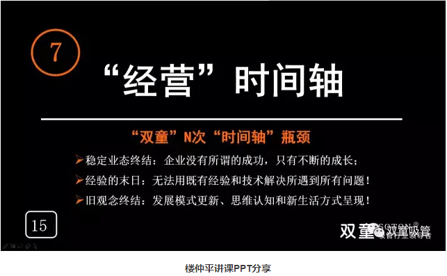 “經(jīng)營”時間軸:樓仲平也用“雙童”的發(fā)展史告訴大家經(jīng)營也是有時間軸的,會遇到瓶頸和“天花板”。企業(yè)沒有所謂的成功,只有不斷的成長,我們無法用既有經(jīng)驗和技術(shù)解決所遇到所有問題!