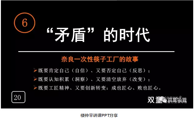 “矛盾”的時代:“雙童”樓仲平通過日本奈良一次性筷子的故事告訴大家成也工匠精神、敗也工匠精神,沒有改變,“工匠”精神也沒有用。作為創(chuàng)業(yè)者來講,我們不能用過往的經(jīng)驗來理解發(fā)生的一切,否則你會被時代所拋棄。在不同的時代,你對時間和技術(shù)進步的理解是不一樣的,既要肯定自己、又要否定自己;既要認(rèn)知積累、又要清空放棄;既要工匠精神、又要創(chuàng)新轉(zhuǎn)變!