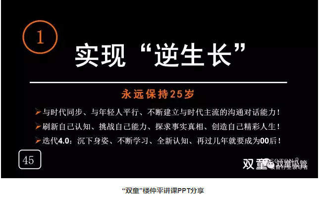 “比方說我自己原來就是小學(xué)文化、草根創(chuàng)業(yè),后來逐漸認(rèn)知到知識的重要性。于是,通過在浙大學(xué)習(xí)進修五年對自己的知識積累進行重構(gòu),通過迭代進行知識的不斷更新,在這期間積累了不少管理理念和商業(yè)知識,從六零后迭代為八零后。早在1997年我就成為了中國的第一批網(wǎng)民,通過互聯(lián)網(wǎng)與世界保持同步,讓‘雙童’在激烈的商海競爭中得到了更多先機,在轉(zhuǎn)型過程中也促使自身從八零后迭代為九零后!接下來,我還將通過不斷學(xué)習(xí)和認(rèn)知迭代為00后。所以,我認(rèn)為自己一直是25歲,也希望大家用時代的思維看問題,與年輕人為伍!”