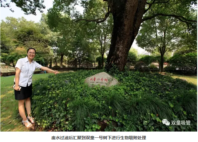 所謂“廢水收集處理循環(huán)回用系統(tǒng)”,其實(shí)就是將員工的生活廢水過濾后匯聚到“ 雙童一號(hào)樹”下進(jìn)行生物吸附處理,再流入中水儲(chǔ)存池,并為廠區(qū)所有衛(wèi)生間的馬桶沖水、綠化噴淋和道路清洗、車輛清洗所用,使公司的員工生活用水量節(jié)省了65%,每年為公司節(jié)省水費(fèi)支出40多萬元!