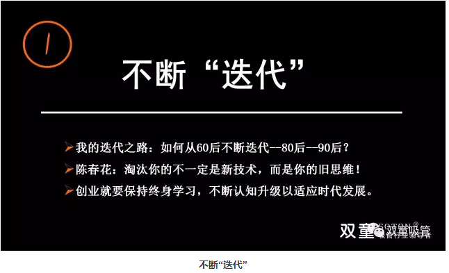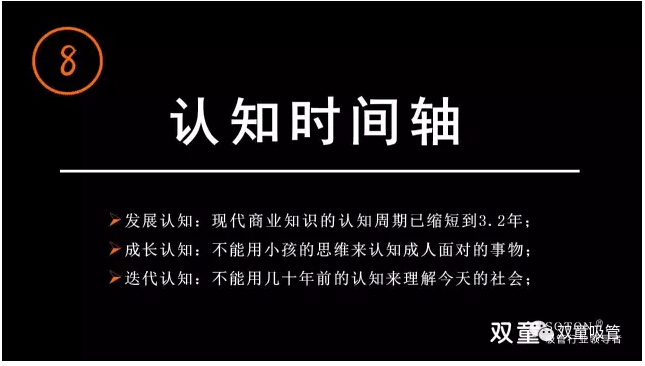現代商業(yè)知識的認知周期已縮短到3.2年,我們不能用小孩的思維來認知成人面對的事物,更不能用幾十年前的認知來理解今天的社會。每個人的成長伴隨著不斷的否定,在認知、糾錯、不斷改變下實現自我成長。“創(chuàng)業(yè)者”最應該有“時間軸”的概念,需要擁有自我蛻變的能力,否則你就很難成長!