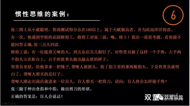 樓仲平通過“盲人買剪刀”及“吵架”兩個小案例和大家分享了認知“慣性思維”:“我們常常會局限于既有的信息或認識的積累,習慣于從固有的角度來觀察、思考事物。這種思維一旦形成就很難打破,并習慣性拒絕接受新事物,久而久之形成固有的思維模式!所以,很多時候限制自己的恰恰是自己的思維定式,我們要跳出自己的思維定式!”