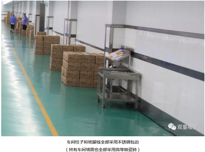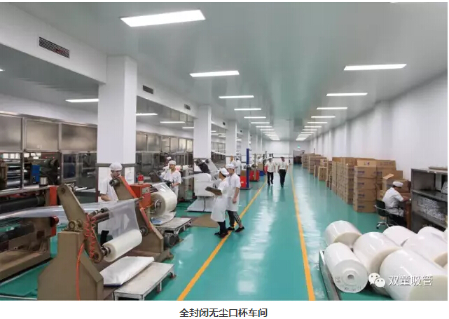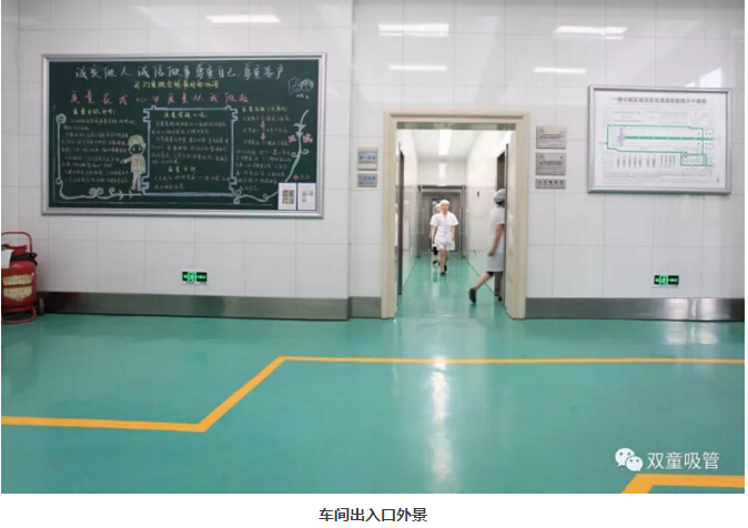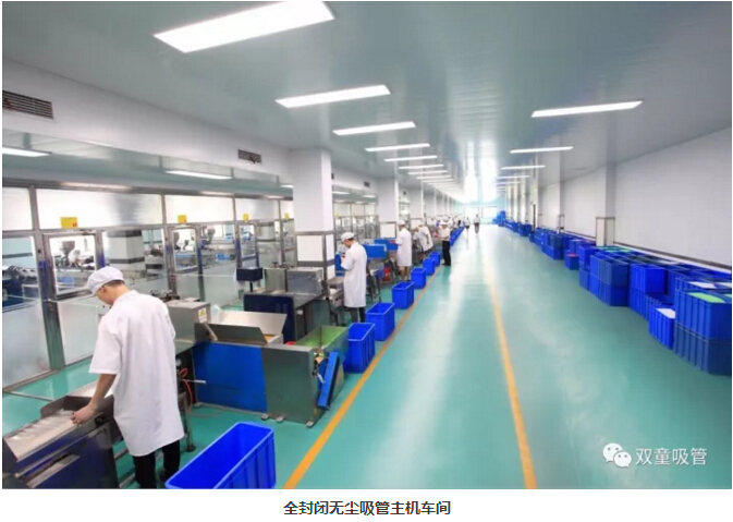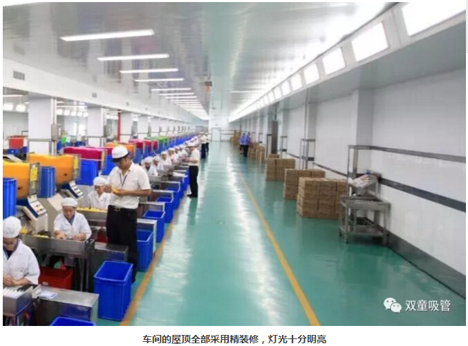 “雙童”車間的每個入口,有著許多安全、衛(wèi)生提示的標(biāo)牌,引導(dǎo)員工門在進(jìn)入車間時要注意安全和衛(wèi)生防護(hù)工作。進(jìn)入車間內(nèi)部,一列列整齊的機(jī)器、一箱箱五顏六色的吸管、一條條清晰分明的分界線,車間內(nèi)全部安裝了恒溫空調(diào),屋頂全部進(jìn)行精裝修寬敞明亮,柱子和地腳線用不銹鋼進(jìn)行包邊,大大增加了建筑年限。所有員工皆穿著潔白的工作服,正在忙碌地進(jìn)行生產(chǎn)工作。