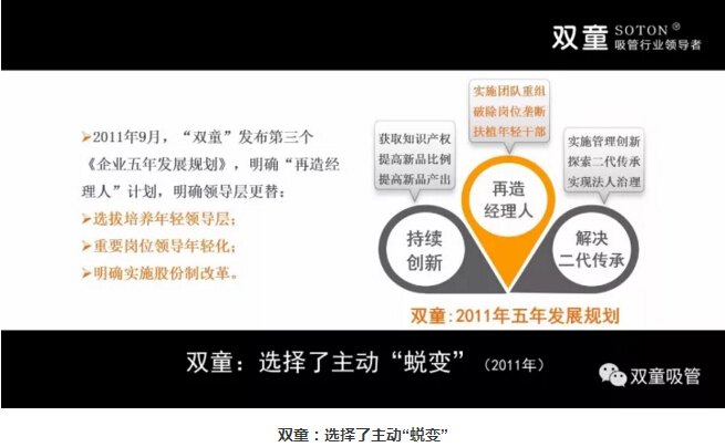 面對這樣的現(xiàn)狀,“雙童”選擇了主動“蛻變”,在2011年發(fā)布了第三個《企業(yè)五年發(fā)展規(guī)劃》,明 確“再造經(jīng)理人”計劃,明確領(lǐng)導(dǎo)層更替:選拔培養(yǎng)年輕領(lǐng)導(dǎo)層、重要崗位領(lǐng)導(dǎo)年輕化、明確實施股份制改革,慢慢解決管理層老化問題!重組后的“雙童”團隊平均年齡不到三十歲,大部分核心團隊的工齡在十年以上,學(xué)歷、知識層次和忠誠度大幅提高!