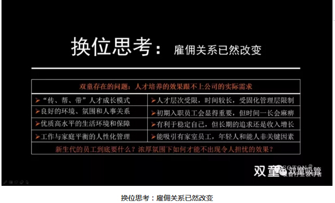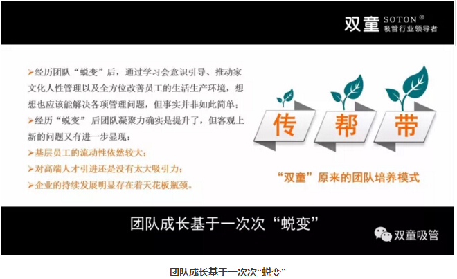“雙童”經(jīng)歷團隊“蛻變”后,通過學(xué)習(xí)會意識引導(dǎo)、推動家文化人性管理以及全方位改善員工的生活生產(chǎn)環(huán)境,提升團隊認(rèn)知意識和凝聚力!經(jīng)歷“蛻變” 后團隊凝聚力確實有所提升,但客觀上基層員工的流動性依然較大,對高端人才引進還是沒有太大吸引力,企業(yè)的持續(xù)發(fā)展明顯存在著天花板瓶頸。