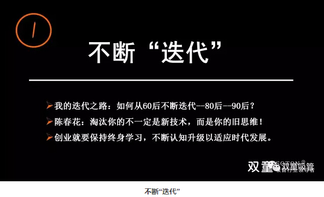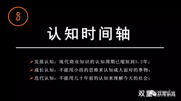 現(xiàn)代商業(yè)知識(shí)的認(rèn)知周期已縮短到3.2年,我們不能用小孩的思維來(lái)認(rèn)知成人面對(duì)的事物,更不能用幾十年前的認(rèn)知來(lái)理解今天的社會(huì)。每個(gè)人的成長(zhǎng)伴隨著不斷的否定,在認(rèn)知、糾錯(cuò)、不斷改變下實(shí)現(xiàn)自我成長(zhǎng)。“創(chuàng)業(yè)者”最應(yīng)該有“時(shí)間軸”的概念,需要擁有自我蛻變的能力,否則你就很難成長(zhǎng)!