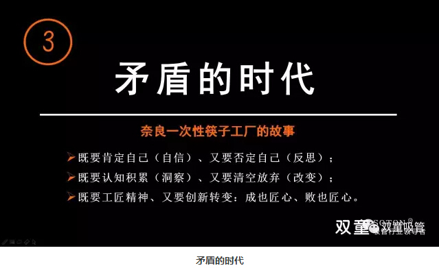 “雙童”樓仲平通過(guò)日本奈良一次性筷子的故事告訴大家成也工匠精神、敗也工匠精神,沒(méi)有改變,“工匠”精神也沒(méi)有用。作為創(chuàng)業(yè)者來(lái)講,我們不能用過(guò)往的經(jīng)驗(yàn)來(lái)理解發(fā)生的一切,否則你會(huì)被時(shí)代所拋棄。在不同的時(shí)代,你對(duì)時(shí)間和技術(shù)進(jìn)步的理解是不一樣的,既要肯定自己、又要否定自己;既要認(rèn)知積累、又要清空放棄;既要工匠精神、又要?jiǎng)?chuàng)新轉(zhuǎn)變!