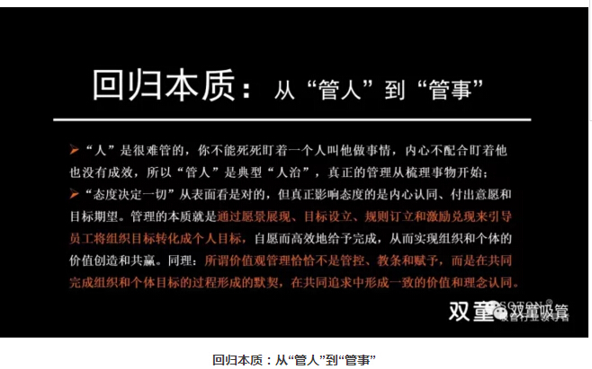 管理的本質(zhì)是“管事”而非“管人”:很多管理者把管理當成一種工具,認為管理是用來操控的,就必須操縱控制員工的行為。其實,“人”是很難管的,你不能死死盯著一個人叫他做事情,員工內(nèi)心不配合盯著他也沒有成效,“管人”是典型“人治”,真正的管理從梳理事物開始。所以,管理的本質(zhì)管理不是管控、教條和賦予,而是在共同完成組織和個體目標的過程形成的默契,在共同追求中形成一致的價值和理念認同。