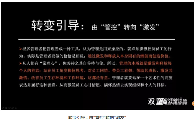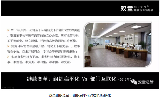 “雙童”組織變革:基于時代的改變和挑戰(zhàn),“雙童”從2015年開始,對原有組織形式進行思考、實踐和探索,逐漸打破行政管理籬笆,通過平等、透明、開放的辦公環(huán)境,消除部門之間的隔閡,實施目標管理和層級開放,弱化上下級關(guān)系,自主開展周會等跨部門溝通探討,提升部門工作效率。同時,實施事務(wù)性權(quán)力下放,大家以解決事務(wù)為核心,讓權(quán)力隨事務(wù)轉(zhuǎn)移,誰主事、誰規(guī)劃;誰負責、誰召集;誰承擔、誰受益,一切以工作結(jié)果為導(dǎo)向,也實現(xiàn)了跨部門互通互聯(lián)、共同探討!