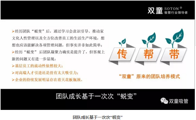 團隊成長基于一次次“蛻變”:公司經(jīng)歷團隊“蛻變”后,通過學習會意識引導(dǎo)、推動家文化人性管理以及全方位改善員工的生活生產(chǎn)環(huán)境,提升團隊認知意識和凝聚力!經(jīng)歷“蛻變” 后團隊凝聚力確實有所提升,但客觀上基層員工的流動性依然較大,對高端人才引進還是沒有太大吸引力,企業(yè)的持續(xù)發(fā)展明顯存在著天花板瓶頸。