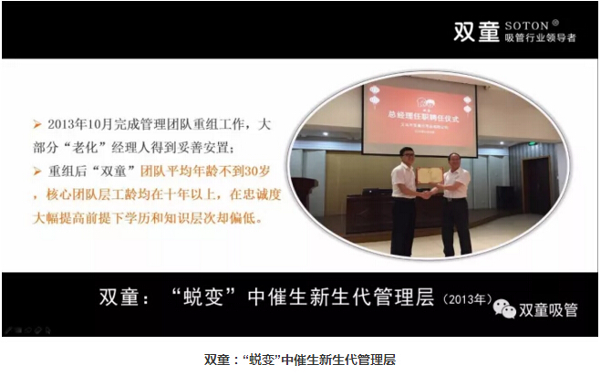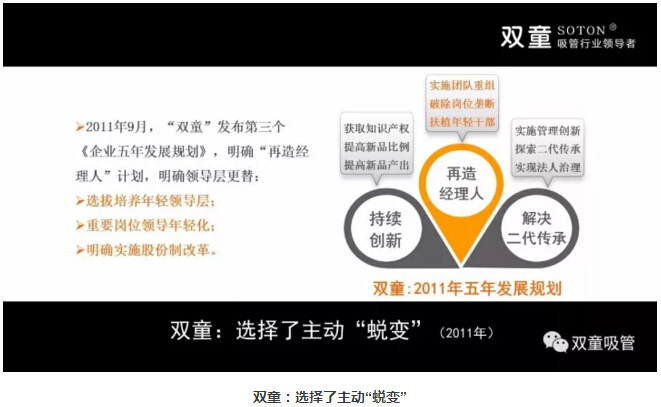 “雙童”選擇了主動“蛻變”:基于上述瓶頸,公司在2011年發(fā)布了第三個《企業(yè)五年發(fā)展規(guī)劃》,明確“再造經(jīng)理人”計劃,明確領(lǐng)導(dǎo)層更替:選拔培養(yǎng)年輕領(lǐng)導(dǎo)層、重要崗位領(lǐng)導(dǎo)年輕化、明確實施股份制改革,慢慢解決管理層老化問題!重組后的“雙童”團隊平均年齡不到三十歲,大部分核心團隊的工齡在十年以上,學歷、知識層次和忠誠度大幅提高!