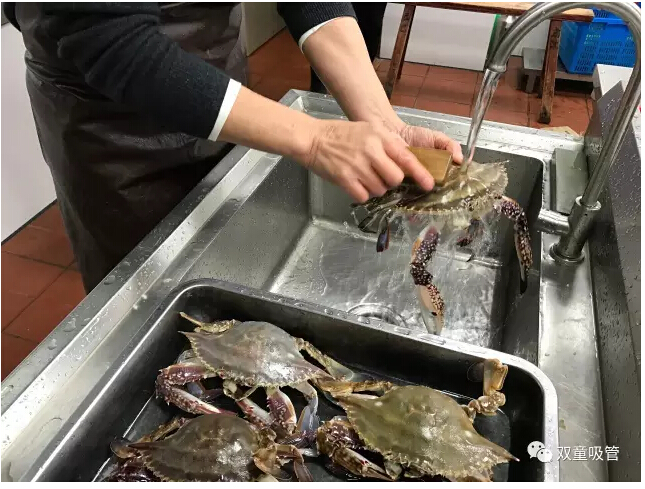 4、用板刷清洗梭子蟹反面以及蟹腳和縫隙。