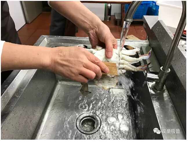 12、取出砂囊后將蟹身兩側(cè)的蟹鰓(看上去像魚鰓)用手工拔除干凈,如果蟹鰓底部有烏黑砂子,千萬(wàn)不要用清水沖洗,用干凈牙刷局部清洗一下就可以了。