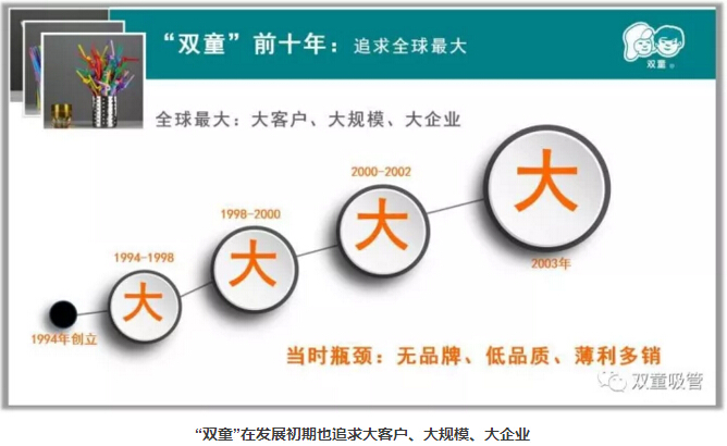 許多人都知道“雙童”有一個被收錄到清華、浙大等大學MBA教材的經(jīng)營戰(zhàn)略,叫做“小客戶原則”。這個經(jīng)營戰(zhàn)略指導“雙童”走出了企業(yè)“大而不強、薄利多銷”的發(fā)展瓶頸,從而牢牢占據(jù)吸管行業(yè)領(lǐng)導者的地位。那么,這個戰(zhàn)略是如何提出的呢?