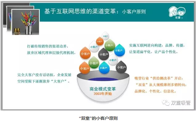 如今,在“雙童”的內(nèi)銷市場中,商超銷售占30%,個性化定制產(chǎn)品占30%,其余40%則是小客戶銷售。據(jù)統(tǒng)計,“雙童”的小客戶總量已達到了12000多家,這些寶貴的客戶客觀上與“雙童”一直發(fā)生著動態(tài)和靜態(tài)的貿(mào)易關(guān)系。有些靜態(tài)客戶可能一兩年才拿一次貨,一次拿幾箱產(chǎn)品。但在“雙童”看來,它們都是寶貴的客戶。正是因為訂單額不大,對產(chǎn)品有個性化要求,反而造就了很高的品牌黏性——它們不至于因為這幾箱吸管而再去找其他企業(yè),從而形成巨大的長尾效應,通過訂單的積累,長期為企業(yè)創(chuàng)造著價值。