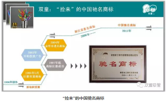 于是,樓仲平就拿著這個(gè)圖案去找義烏工商局咨詢,義烏工商局的科長(zhǎng)直接了當(dāng)?shù)馗嬖V他,這一定是已經(jīng)注冊(cè)過的商標(biāo)了!但樓仲平并不死心,花了三百塊錢查詢費(fèi)要求科長(zhǎng)在電腦上查一下,經(jīng)過查證之后發(fā)現(xiàn)這個(gè)商標(biāo)還真沒有人注冊(cè),于是,樓仲平立馬帶著相關(guān)證件,用了2000元搶占先機(jī),把這個(gè)圖案注冊(cè)為商標(biāo)。在確定商標(biāo)名稱時(shí),根據(jù)圖案上兩個(gè)兒童的標(biāo)志,樓仲平夫婦將“雙童”確定為商標(biāo)的名字。正是樓仲平的這次舉措,“撿來”了“雙童”的中國(guó)馳名商標(biāo),也邁出了企業(yè)的品牌建設(shè)發(fā)展最為關(guān)鍵的一步,改變企業(yè)命運(yùn)的同時(shí)也提升了整個(gè)行業(yè)的認(rèn)知!
