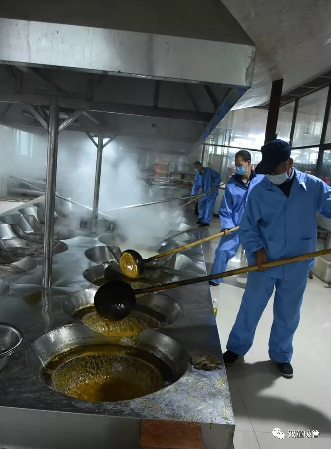 在參觀體驗的過程當(dāng)中,“敲糖幫”陳總也親自帶隊和大家介紹了紅糖的制作過程和琳瑯滿目的紅糖產(chǎn)品。在陳總的介紹當(dāng)中,我們得知義烏紅糖都是由古法制作而成。首先,用牛拉木車絞蔗汁(現(xiàn)在用先進的榨糖機器),然后用鍋爐燒一字排開的九連糖鍋,糖鍋直徑依次由大到小。接著,把絞出的糖水放入第一口最大的鍋中燒煮,一步步讓水分慢慢蒸發(fā)干凈,當(dāng)糖水蒸發(fā)到一定時候,煎熬的糖水變成了金黃色,在鍋中冒著濃稠而滾圓的泡泡,幾個熬糖師傅用長柄鐵勺不停地攪動糖鍋,防止稠糖焦鍋底,直到將全部濃稠的糖漿起到最末端的一口鍋中熬好,再舀到一個長方形的木制槽床上,制作成品質(zhì)高端的敲糖幫紅糖,這些紅糖可以加工成麻花等紅糖產(chǎn)品。