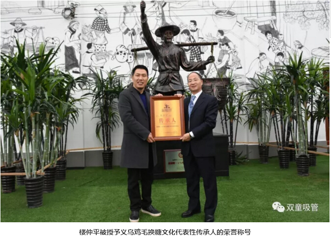 在分享環(huán)節(jié)時,“敲糖幫”李總為末代貨郎樓仲平授予了義烏“雞毛換糖”文化代表性傳承人的榮譽稱號。有客戶也在現(xiàn)場問“雞毛換糖”中的雞毛是事干什么用的?樓仲平也在現(xiàn)場親身分享“雞毛換糖”中雞毛的用途。
