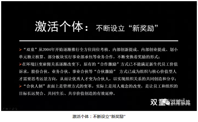 激活組織的同時,“雙童”也在激活個體上絞盡腦汁,不斷設置“新獎勵”。公司從2004年開始逐漸推行全方位崗位考核、內部創(chuàng)新提成、內部創(chuàng)業(yè)提成、劃小單元獨立核算、部分板塊實行事業(yè)部承包等業(yè)務合作,不斷變換著獎勵的形式。同時,股份合伙、業(yè)務合伙、事業(yè)合伙等“合伙激勵” 方式已成為組織與核心價值型人才需要思考遠景方向,從而讓優(yōu)秀人才變?yōu)楹匣锶?,以實現(xiàn)組織關系的共同創(chuàng)造和分享!