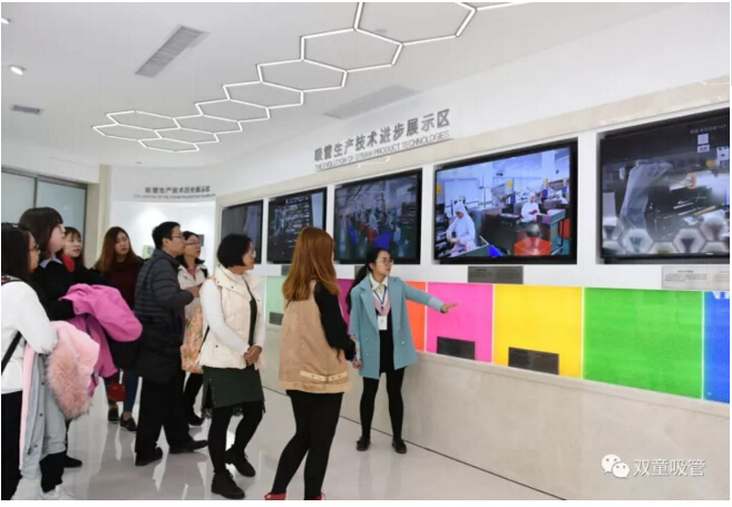 在參觀了吸管墻后,大家也了解了特殊的長吸管,長吸管和普通吸管的不同之處是它帶有“雙童”的專利——止回閥,有了止回閥,吸上去的水不會再回流到桶里,從而讓人們在用長吸管飲用過程中有一個更好的體驗!緊接著,大家參觀了吸管產(chǎn)品形態(tài)展示區(qū),單支包裝吸管、常規(guī)類吸管產(chǎn)品、用于飲料配套的工業(yè)配套吸管、紙吸管、水晶玻璃吸管……形態(tài)各異的也讓參觀團隊們看花了眼,直呼真是長見識了!