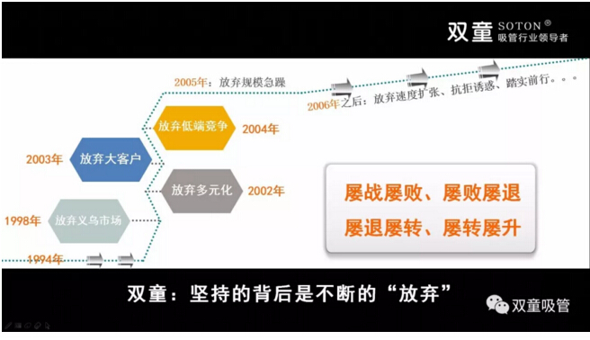 “雙童”堅(jiān)持的背后也伴隨著不斷的放棄,放棄義烏市場(chǎng)、放棄多元化……2003年開(kāi)始,“雙童”決定放棄繼續(xù)擴(kuò)張,放棄低端競(jìng)爭(zhēng),在原有的規(guī)模下改變商業(yè)模式,寧可盈利不做大,不要做大不盈利。但“雙童”堅(jiān)持的是實(shí)業(yè)、是事業(yè)、而非某個(gè)單一產(chǎn)品!這個(gè)世界的發(fā)展是多元的,存在既有道理:也許五年十年后,“雙童”涉足其他領(lǐng)域已不再生產(chǎn)吸管!