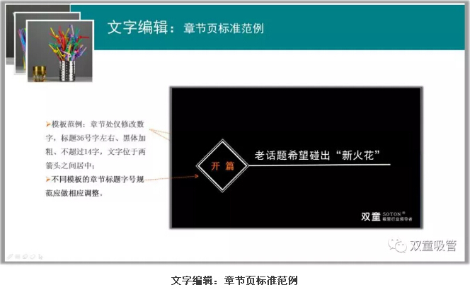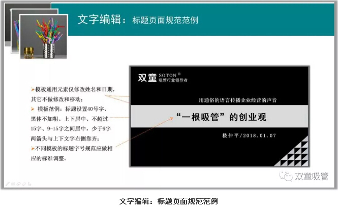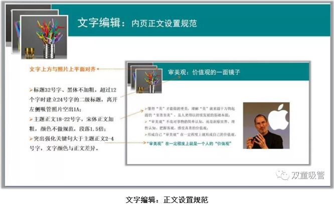 對PPT的空間進(jìn)行設(shè)置之后,文字編輯的標(biāo)準(zhǔn)規(guī)范也是制作PPT的重中之重!樓仲平和同學(xué)們詳細(xì)分享了模板文字設(shè)計(jì)標(biāo)準(zhǔn)規(guī)范、標(biāo)題的文字編輯規(guī)范,章節(jié)頁文字標(biāo)準(zhǔn)規(guī)范、正文的文字編輯規(guī)范、正文分段行間標(biāo)注規(guī)范等文字編輯的規(guī)范要求。