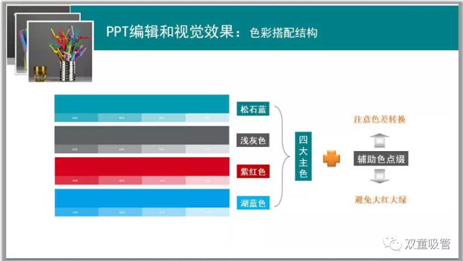想要制作一個(gè)美觀的PPT,色彩的搭配也尤其重要!樓仲平也分享了色彩搭配的相近原則、色彩點(diǎn)綴的相對原則等技巧,下面就通過圖片來看看色彩的搭配和一些錯(cuò)誤的案例吧!