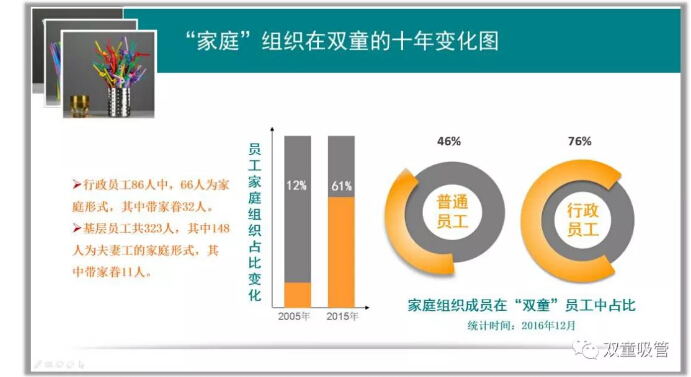如今,“雙童”300多人的基層員工中就有148人的夫妻工,以家庭形式在公司生活的員工占比達(dá)到了61%,久而久之便形成了“雙童”特有的“家文化”!![]()