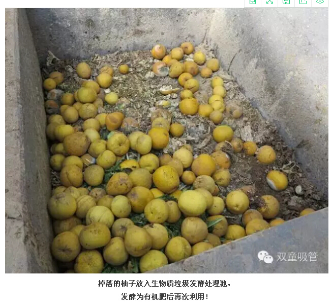 成熟后的柚子會掛在枝頭長達幾月之久,直到深冬后才會陸續(xù)掉落。“摳門”的“雙童”人當然不會放過它啦,我們把所有掉落的柚子收集后放入生物質(zhì)垃圾發(fā)酵處理池,形成有機肥后再次利用!而一部分“頑強”的柚子,甚至能堅持到第二年新一輪柚子長出后,仍然掛在枝頭呢!