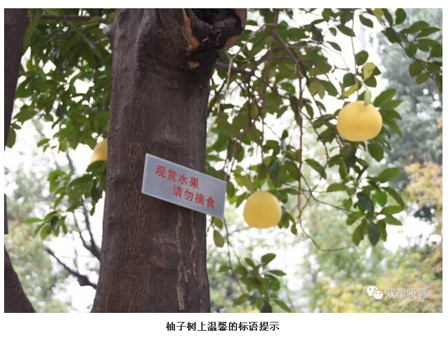 原來,為了“雙童”的生態(tài)和美觀,公司明確柚子是觀賞性水果,每棵柚子樹上都有“觀賞水果,請勿摘食”的字樣,提醒和引導(dǎo)員工不要摘食觀賞水果。