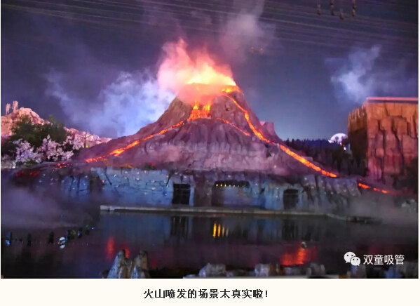 到了晚上730分,精彩的表演開始了!高35米的火山在漆黑的夜幕中突然爆發(fā),熱浪沖天,火山熔巖漿滾滾而下…… 整個演出使用了激光高科技,將水面和空中演繹的若夢若幻,美輪美奐,讓大家震撼到贊不絕口!