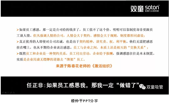 接下來(lái),樓仲平也以陳春花老師《激活組織》中任正非的案例分享了員工和企業(yè)之間應(yīng)該是良性的契約關(guān)系。任正非認(rèn)為:如果員工感恩,那一定是公司給的錢多了,員工值不了這個(gè)價(jià)。真正優(yōu)秀的人即使對(duì)公司忠誠(chéng),也是出于契約精神,講究責(zé)、權(quán)、利平衡。員工與企業(yè)之間,本質(zhì)上還是相互的“交換關(guān)系”。既然員工和企業(yè)是一種契約關(guān)系,員工付出勞動(dòng),企業(yè)給予報(bào)酬,強(qiáng)調(diào)感恩往往是本末倒置。實(shí)質(zhì)是企業(yè)用虛無(wú)縹緲的道德去“綁架”員工!