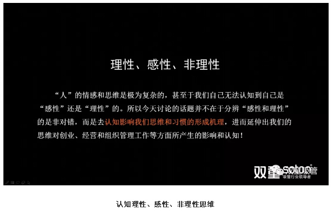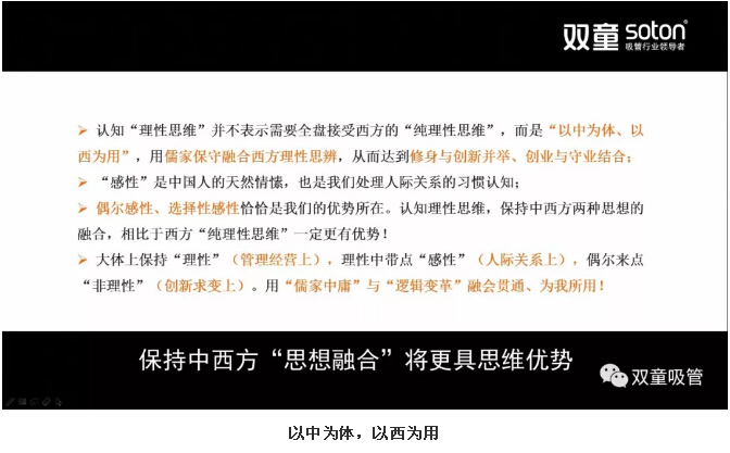 用中國(guó)人的感性思維來(lái)解決在生活中、家庭中的人際關(guān)系,用西方“理性思維”的邏輯推理來(lái)解決企業(yè)經(jīng)營(yíng)過(guò)程中的方方面面,從而達(dá)到中西方兩種思想的融合!大體上保持“理性”(管理經(jīng)營(yíng)上),理性中帶點(diǎn)“感性”(人際關(guān)系上),偶爾來(lái)點(diǎn)“非理性”(創(chuàng)新求變上),用“儒家中庸”與“邏輯變革”融會(huì)貫通、為我所用!