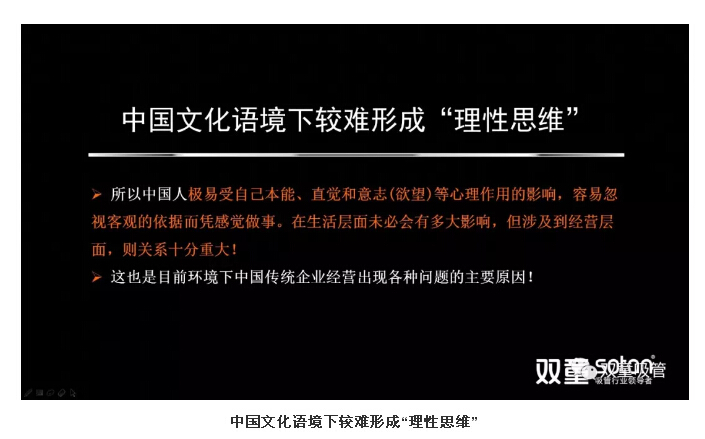 通過(guò)以上對(duì)比,我們可以得出:中國(guó)文化以“仁愛(ài)”精神作為人性的最高追求,在實(shí)踐上追求實(shí)用性,對(duì)事物背后的“存在”缺乏“本質(zhì)”的認(rèn)知和探索,容易形成“思維遮蔽”。中國(guó)人極易受自己本能、直覺(jué)和意志(欲望)等心理作用的影響,容易忽視客觀的依據(jù)而憑感覺(jué)做事。在生活層面未必會(huì)有多大影響,但涉及到經(jīng)營(yíng)層面,則關(guān)系十分重大!這也是目前環(huán)境下中國(guó)傳統(tǒng)企業(yè)經(jīng)營(yíng)出現(xiàn)各種問(wèn)題的主要原因!