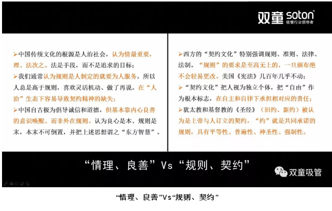 在中國這樣的大環(huán)境下,我們會用情理、良善去認知管理。中國傳統(tǒng)文化的根源是人治社會,倡導“熟人文化”,認為情最重要,理、法次之。中國自古極為倡導誠信和道德,但基本靠內(nèi)心良善的意識喚醒、而非外在規(guī)則,從而導致“煽情式”管理大行其道:無視責、權、利平衡,大談無私奉獻、感恩付出、大善大愛,諸不知人性中“情感”只能短期激發(fā),長期持續(xù)必然導致精神麻痹!