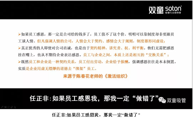 接下來,樓仲平也以陳春花老師《激活組織》中任正非的案例分享了員工和企業(yè)之間應該是良性的契約關系。任正非認為:如果員工感恩,那一定是公司給的錢多了,員工值不了這個價。真正優(yōu)秀的人即使對公司忠誠,也是出于契約精神,講究責、權、利平衡。員工與企業(yè)之間,本質(zhì)上還是相互的“交換關系”。既然員工和企業(yè)是一種契約關系,員工付出勞動,企業(yè)給予報酬,強調(diào)感恩往往是本末倒置。實質(zhì)是企業(yè)用虛無縹緲的道德去“綁架”員工。