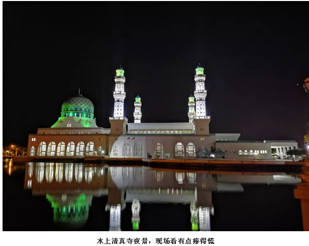 沙巴大學(xué)出來(lái)后,我們開著車去亞庇最有名的大茄來(lái)海鮮店,途中經(jīng)過(guò)了我們白天沒時(shí)間去的水上清真寺。原本照片上美麗的藍(lán)白清真寺到了晚上,竟然在燈光的效果下變成了綠白色,有點(diǎn)嚇人就是了……我們約定好要在后面白天有空的時(shí)候再來(lái)打卡。