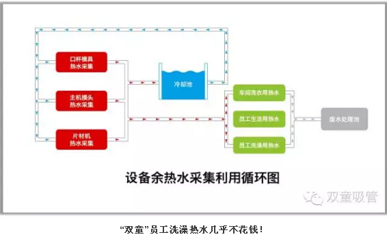 設(shè)備余熱水采集和設(shè)備余熱采集循環(huán)系統(tǒng):“雙童”對所有經(jīng)過模具的50度溫水進(jìn)行收集,處理之后供應(yīng)到所有寢室衛(wèi)生間給員工洗澡洗衣生活之用。同時,“雙童”也引進(jìn)日本技術(shù)對所有生產(chǎn)設(shè)備的余熱和廢氣進(jìn)行采集并回收,再通過空調(diào)管道輸送到需要加溫的各個車間和工段。通過上述方式,“雙童”光是在余熱水采集和設(shè)備余熱采集方面,每年就節(jié)省了150多萬元,消滅了企業(yè)產(chǎn)生的污染和排放!