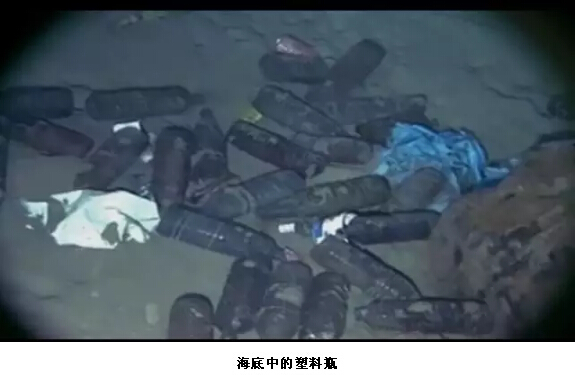 在深度計數(shù)器顯示海底1600米的地方,發(fā)現(xiàn)海底居然也是有著許多塑料瓶。