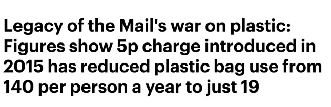 “根據(jù)數(shù)據(jù)顯示,自2015年推出對每個塑料袋征收5便士(約4.5毛)稅款法案后,英國的塑料袋使用量從人均每年140個降至19個!”