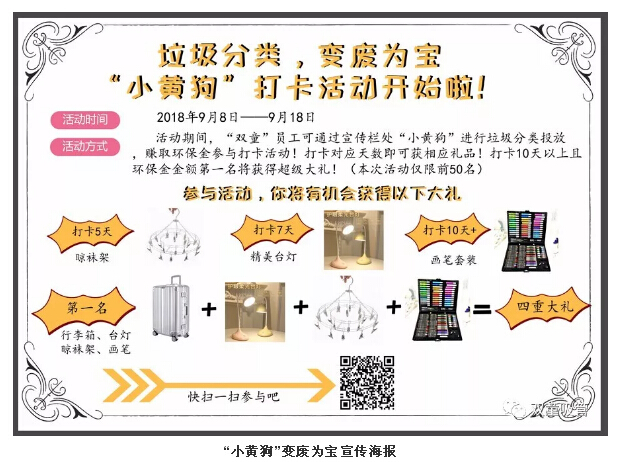 這次活動的參與方式也是十分的簡單,在活動期間內(nèi),“雙童”員工們只需將日常生活中的垃圾分類后投放至“小黃狗”,獲取相應(yīng)環(huán)保金即可進(jìn)行打卡。而打卡相應(yīng)天數(shù)就能兌換相應(yīng)的獎(jiǎng)品。
