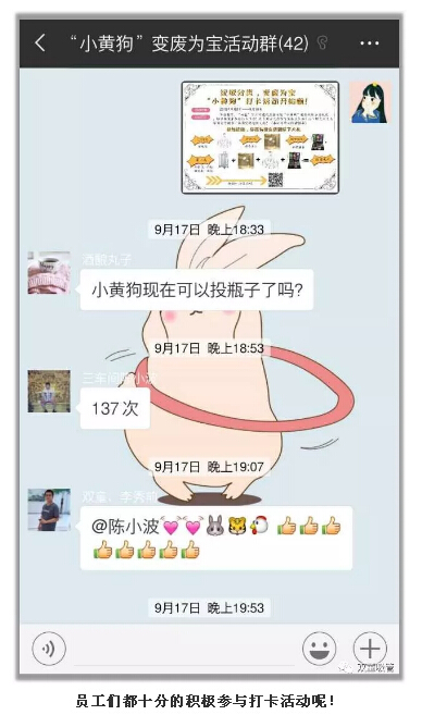 “雙童”員工們的行動力也十分給力,積極的參與“垃圾分類,變廢為寶”打卡活動,主動的將空飲料瓶以及廢棄的紙類文件、報(bào)紙等垃圾“投喂”給“小黃狗”。