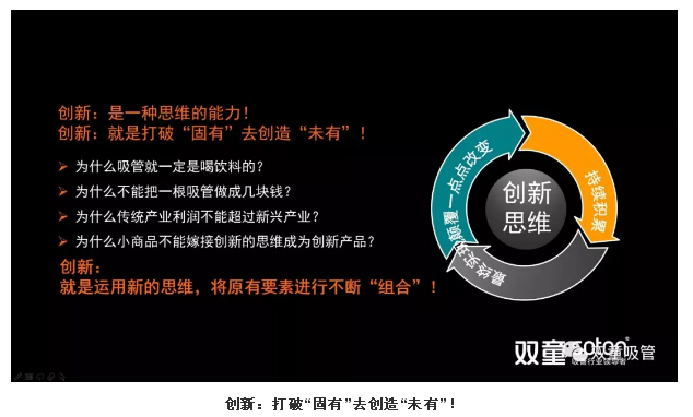 現(xiàn)在,不少人動不動就喊要創(chuàng)新,但是到底什么是創(chuàng)新?我一直理解創(chuàng)新工作的本質(zhì)在于“思維創(chuàng)新”,就是運用新的思維,將原有要素進行不斷“組合”,打破“固有”創(chuàng)造“未有”。只有用創(chuàng)新思維去做產(chǎn)品、做事業(yè),才能改變自己乃至于整個企業(yè)的命運!