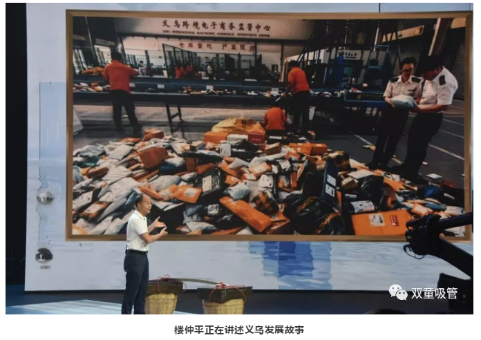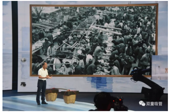 在節(jié)目現(xiàn)場,“雙童”樓仲平也帶來了許多精彩的照片。其中,開場照片便是義烏這座城市的對比照片。通過挑貨郎與義烏小商品城開展全球電商的照片對比,樓仲平講述了義烏如何從貧瘠落后的小縣城發(fā)展為全球最大的小商品集散中心的故事……