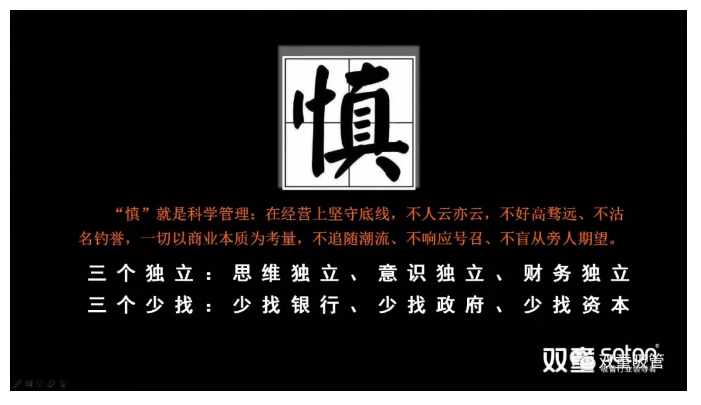 最后,“慎”也是科學(xué)管理的本真,我們要有自己獨(dú)立的思維,在經(jīng)營(yíng)上要有自己的獨(dú)立判斷,堅(jiān)守底線,不人云亦云,一切以商業(yè)本質(zhì)為考量,不追隨潮流、不響應(yīng)號(hào)召、不盲從旁人期望?;谝陨希瑯侵倨娇偨Y(jié)出“三個(gè)少找”和“三個(gè)獨(dú)立”: