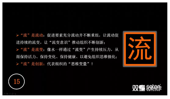 首先,“流”代表的是在高速變化的時(shí)代下,資源和信息高速流變,人才高度流動(dòng)……我們要通過(guò)主動(dòng)的方式、迎合的方式、應(yīng)變的方式、創(chuàng)新的方式,從而保持企業(yè)有序流動(dòng),保持創(chuàng)新。