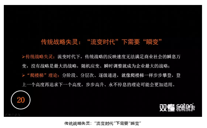 再者,“流”在更深層次上也可以理解為創(chuàng)新,它代表組織的“思維變量”。它是在商業(yè)基礎(chǔ)流變下迭代速度的加速,我們要以變應(yīng)變,用“主動(dòng)流變”去維持“持續(xù)應(yīng)變”,從而讓企業(yè)所有成員感知到其危機(jī)所在,不斷迭代,從而提高組織的產(chǎn)出效率!