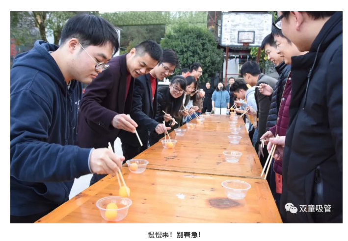 熱身活動過后,迎來了“夾乒乓球”大賽。每個小組的隊員依次夾起乒乓球放入下一個人碗中,直到所有球都傳到最后一個人手中,率先完成的小組獲勝!