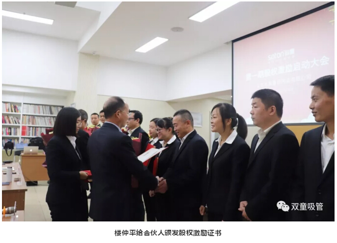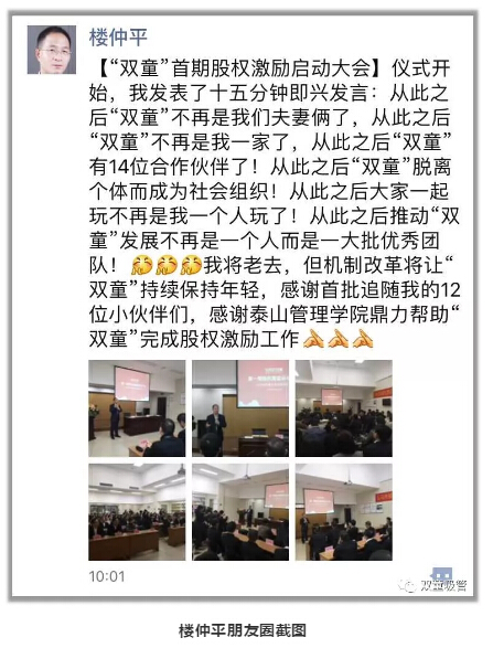 “我終將老去,但機(jī)制改革將讓‘雙童’持續(xù)保持年輕,感謝所有的員工,感謝首批追隨我的12位小伙伴們,感謝泰山管理學(xué)院鼎力幫助‘雙童’完成股權(quán)激勵(lì)工作!”